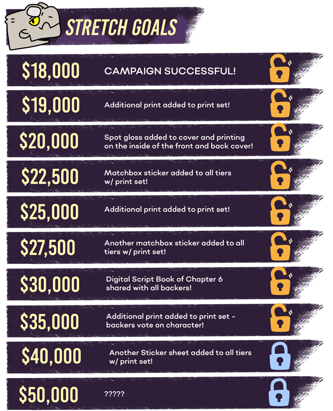 There’s actually even more, but you get the picture! We’ve also smashed through a bunch of push goals, and we’re working on the next one— at 40K, we’ll add another sticker sheet (like the Selfies one) to all tiers with a print set.